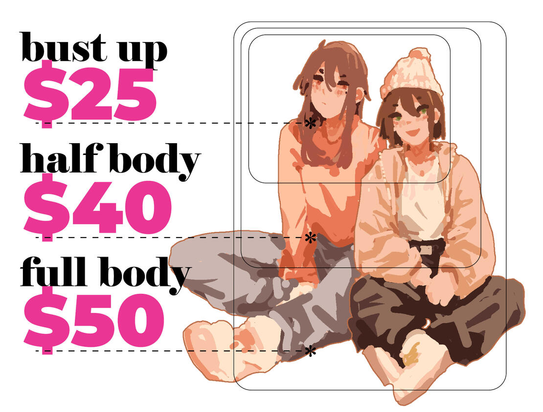 - I have the right to reject a commission- Previously mentioned prices are for personal use only, price for commercial use is double the original price- Whole revisions will cost $5 per revision with a maximum of 3x revisions
